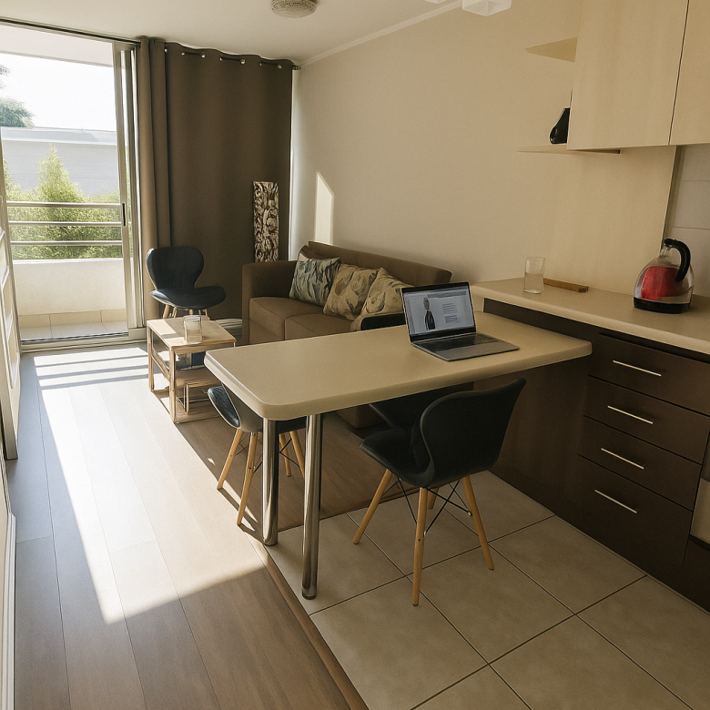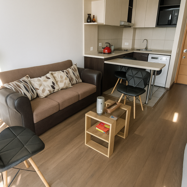 Departamento práctico y luminoso en piso 5, ubicado en Condominio Comunidad Nuevo Mundo (eje Vicuña Mackenna), a pasos de Metro Rodrigo de Araya (L2).